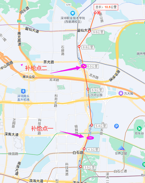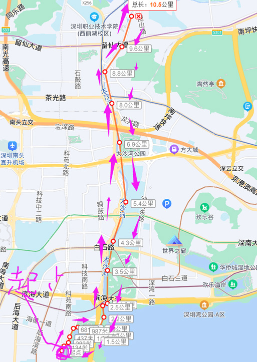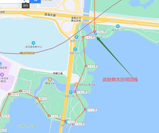 起点:人才公园求贤阁 ==》顺时针方向跑到海边往红树林方向跑 ==》大沙河入海口左转沿大沙河跑 ==》手表显示10.5km时候返回 ==》沿大沙河往海的方向跑到尽头右转 ==》沿海边一直跑到人才公园入口 ==》人才公园跑到顺时针方向跑回求贤阁