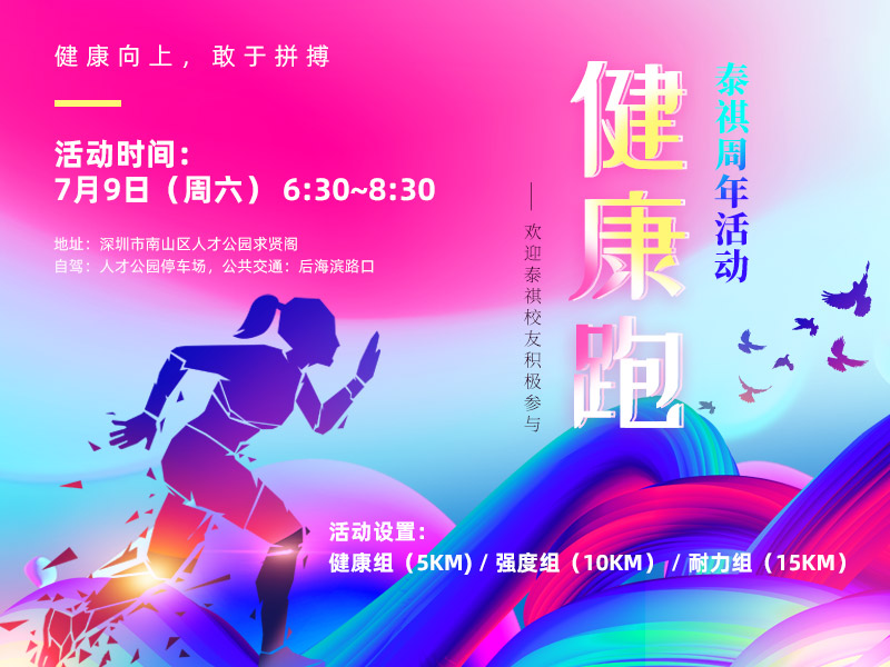 为庆祝泰祺20周年及深圳泰祺15周年,弘扬健康向上,敢于打拼深圳精神,特举办校友健康跑活动,设置:健康组(5KM)、强度组(10KM)、耐力组(15KM)三种活动,欢迎泰祺校友积极参与。