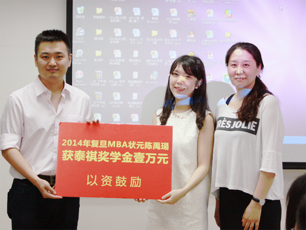复旦大学MBA招生主管赵昱老师和泰祺校长姜铭昊老师一起为复旦大学2014届状元陈禹瑒同学颁奖。